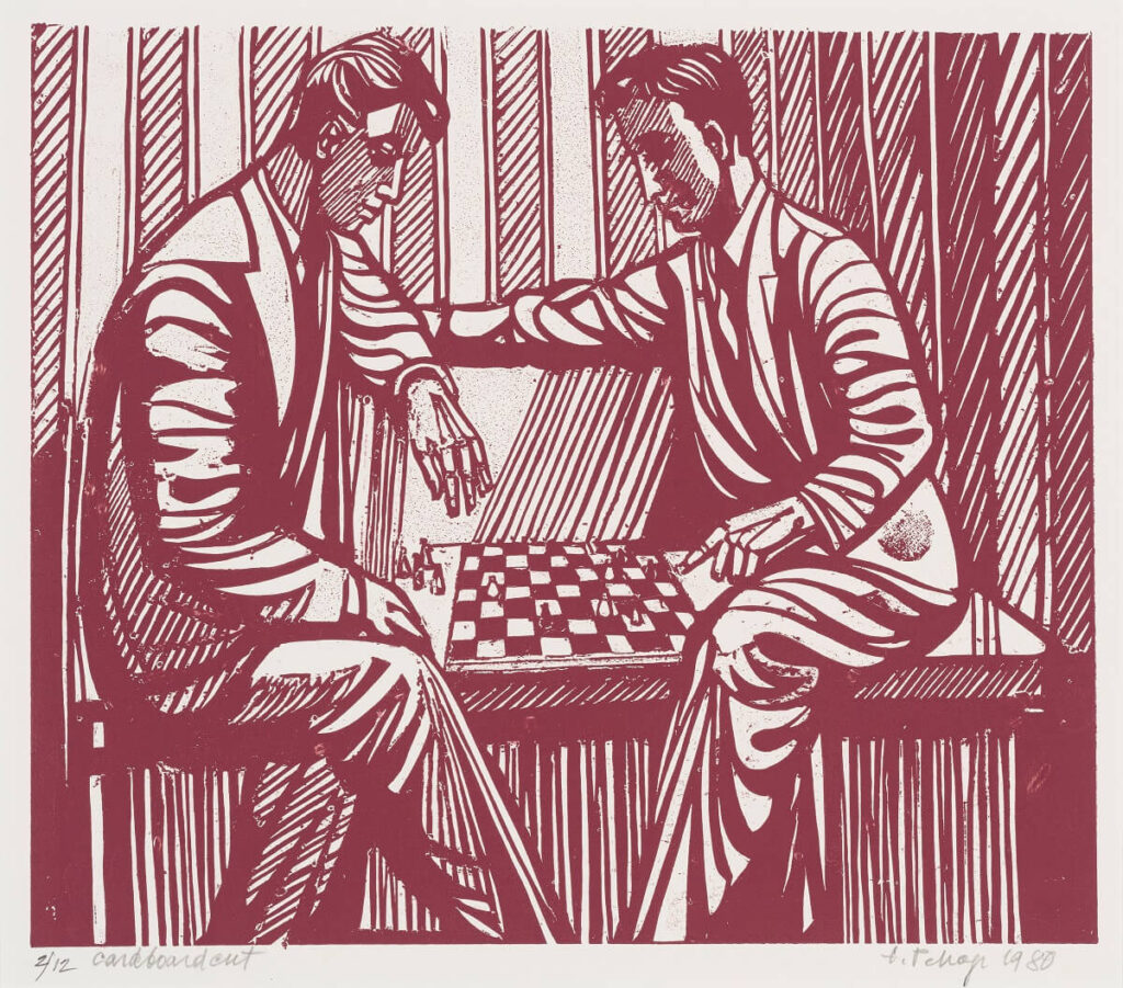 Linoollõige; 35 x 40 cm; all vasakul: 2/12 cardboard cut; all paremal: E. Pehap 1980